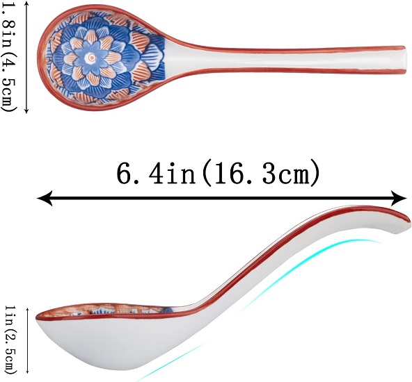 【Longer】6.4 inches in length designed for a comfortable grip to keep your hands away from hot soup. You can spoon up more food at a time and enjoy your meal. Curved tail design, the spoon does not easily slide into the bowl as a whole.