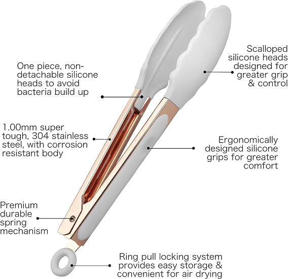 Food contact safe and designed with your safety in mind to prevent burns and avoid germs. Features a firm locking feature that is user friendly, simply pull the secure locking ring outwards and hang from the loop for storage.